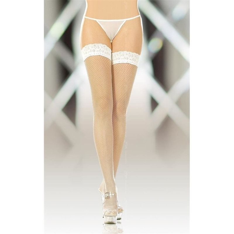Bas Blanc en résille moyenne avec sa dentelle et bandes silicone aux jarretières. Auto Fixant.
