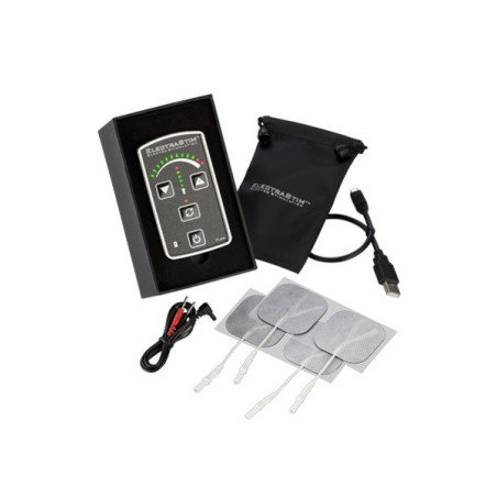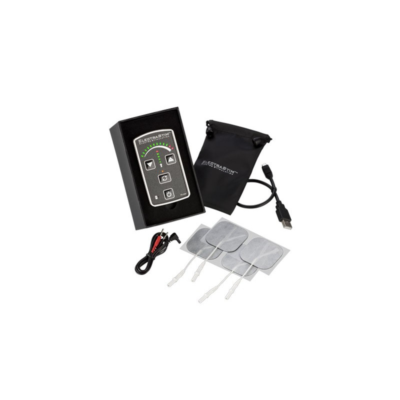 Boitier rechargeable d'électro stimulation et 4 électrodes uni-polaire qui apporteront une intensité à la stimulation sexuelle. Pour la masturbation masculine ou féminine, en couple pendant l'acte ou même au moment des préliminaires.