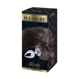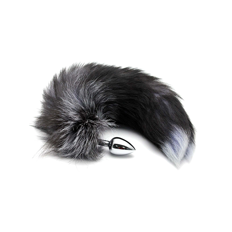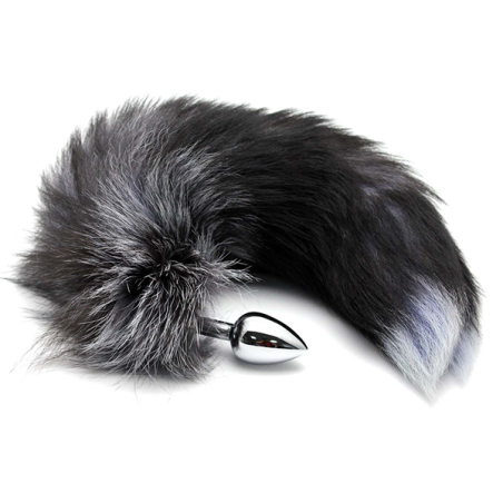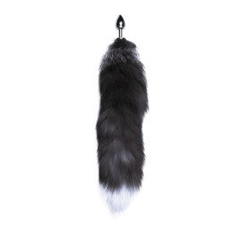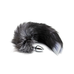 Un joli bijou plug anal ergonomique en alliage zinc argenté avec sa jolie queue de Renard noire parsemée de blanc, toute douce.
