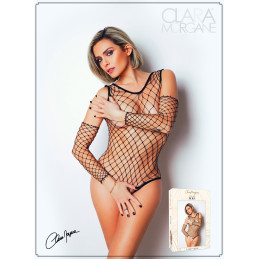 Féminin, chic et sexy body en micro résille avec son maxi décolleté et ses manches évasées. Col à nouer devant. Bouton pression entre jambes.