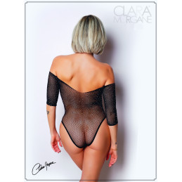 Féminin, chic et sexy body en micro résille avec son maxi décolleté et ses manches évasées. Col à nouer devant. Bouton pression entre jambes.