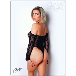 Body noir en wetlook souple avec le haut en matière transparente brodée de fleurs noires.Dos entièrement nu.