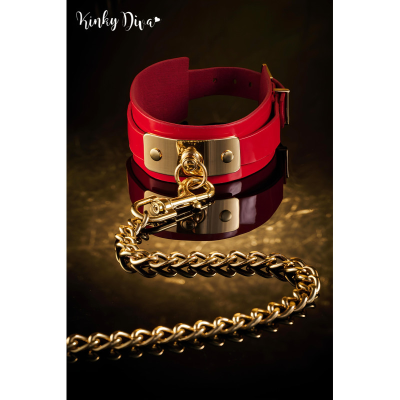 Collier ras de cou en vernis rouge avec sa large plaque dorée et laisse à mousqueton avec rivets, boucle et anneau doré.