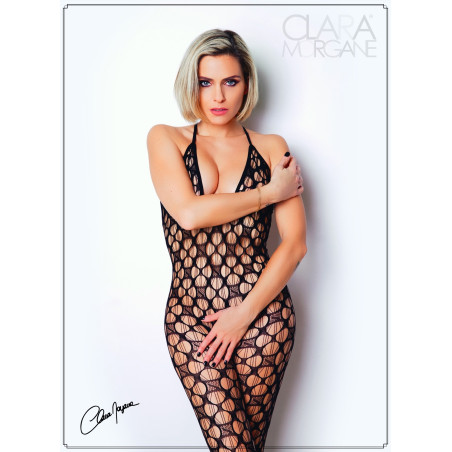 Bodystocking en résille géométrique et ses bretelles nouées au cou. Ouvert entre jambes.