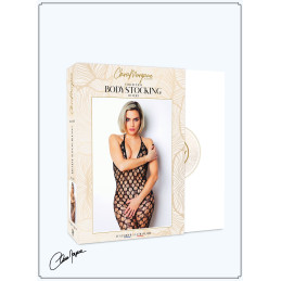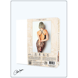 Bodystocking en résille avec son décolleté profond effet lacé et bordé en opaque jusqu'au cou. Ouvert entre jambes.