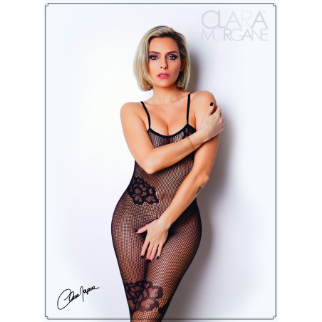 Bodystocking en résille avec ses fins motifs de fleurs sur la partie haute formant un body sexy. Ouvert entre jambes.