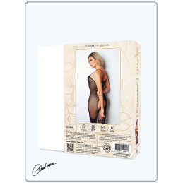 Bodystocking en résille avec son décolleté profond effet lacé et bordé en opaque jusqu'au cou. Ouvert entre jambes.