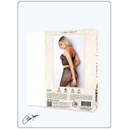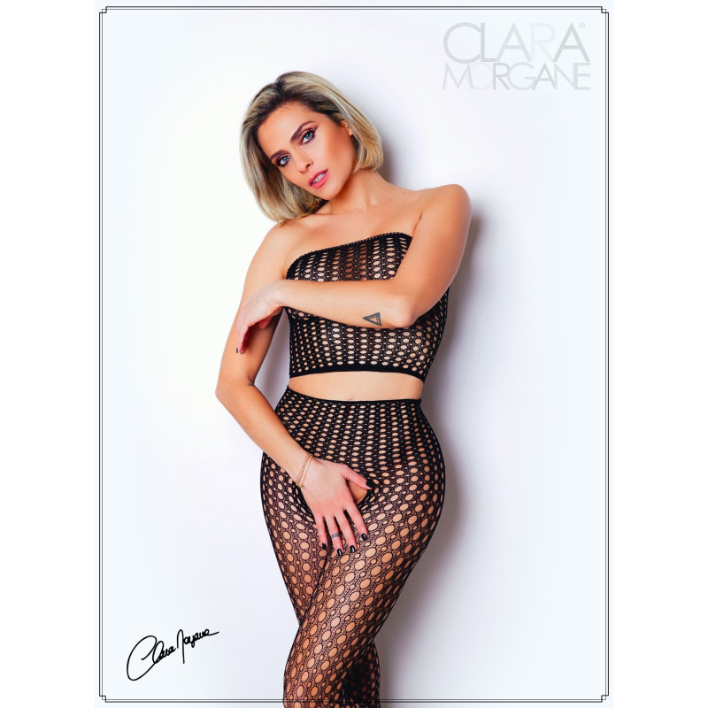 Ensemble en résille noire avec son crop top à la découpe originale et son collant porte jarretelles et bas en une seule pièce.