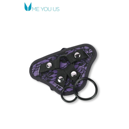 Ce harnais réglable violet recouvert de dentelle noire vous permettra d'y adapter différents godes ventouse grâce à ses deux anneaux de tailles différentes.