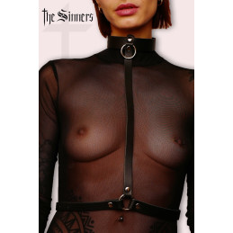 Superbe harnais de buste en cuir noir avec sa double lanière sous poitrine et ses anneaux et attaches argentées qui orne sublimement le corps.A porter comme bijou de corps pour embellir vos tenues ou sublimer vos formes.