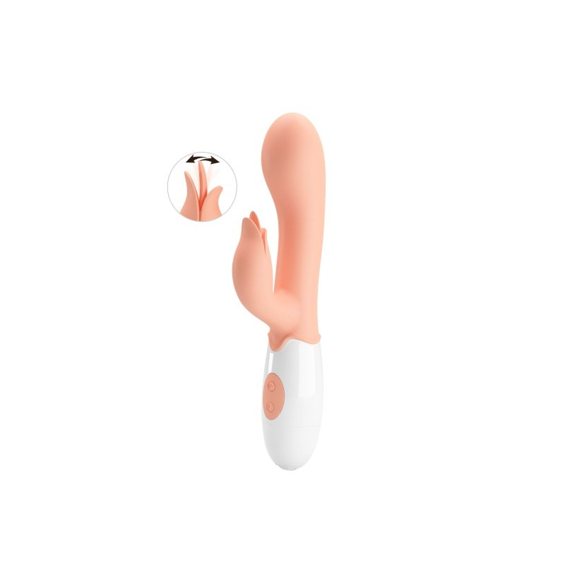Un vibromasseur Rabbit avec son stimulateur clitoridien aux mouvements de gauche à droite.Deux moteurs et 12 modes de vibrations, vaginal point G et clitoridien. Rechargeable USB.