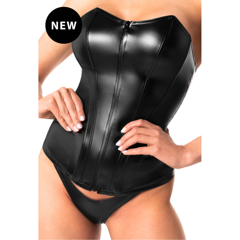 Très glamour corset en wetlook avec ses baleines semi rigides, une belle découpe aux hanches pour un galbe parfait et zip devant.