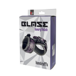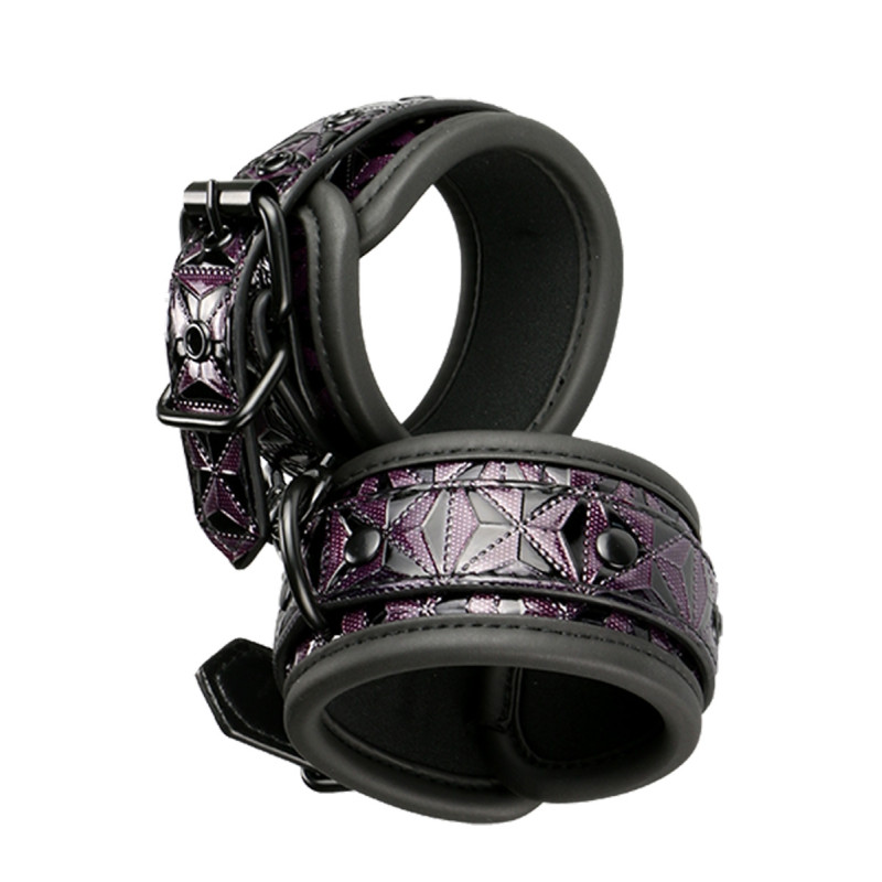 Belles menottes poignets en simili cuir matelassé losange irisé violet avec boucles et rivets noirs. Réglage par boucle. Menottes poignets réglables. Belle finition en matelassé irisé violet. Matière PVC/Néoprène/Métal Boite 12 x 21 x 6.50