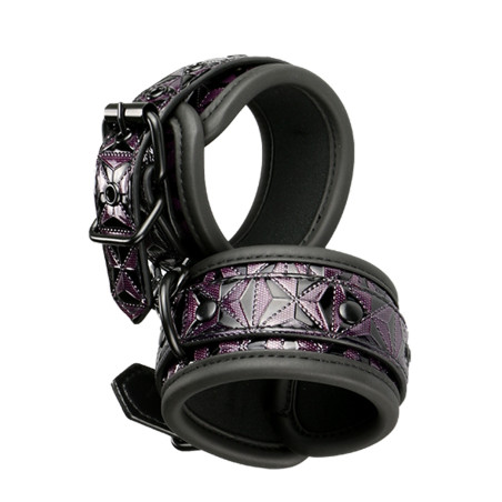 Belles menottes poignets en simili cuir matelassé losange irisé violet avec boucles et rivets noirs.
