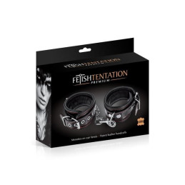 Élégantes menottes en vernis noire avec double anneau doré et mousqueton double attache.