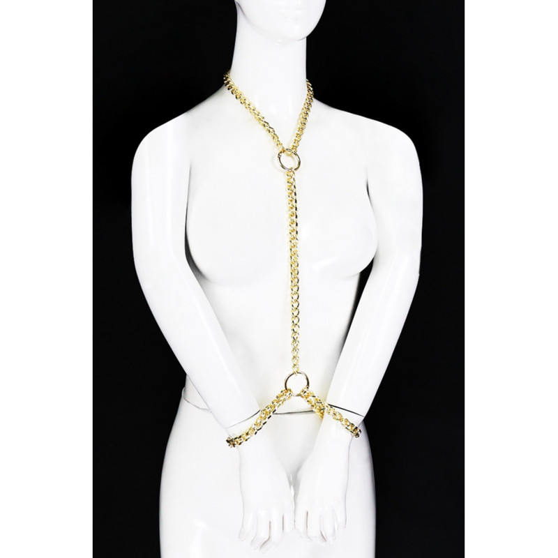 Cette sangle relie le cou à la taille avec plusieurs anneaux et ses menottes poignets pour une soumission érotique. Masque offert.