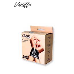 Menottes poignets aspect vinyle noir avec 2 mousquetons et petite chaine argentée.