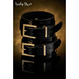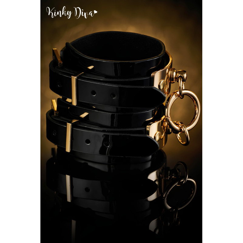 Élégantes menottes poignets en vernis noir avec son anneau doré qui peut se détacher pour y attacher d'autres accessoires.