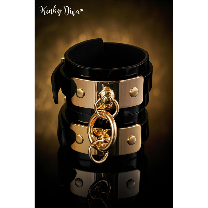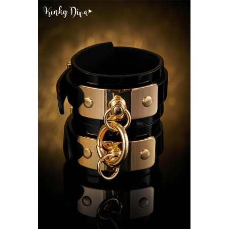 Élégantes menottes poignets en vernis noir avec son anneau doré qui peut se détacher pour y attacher d'autres accessoires.