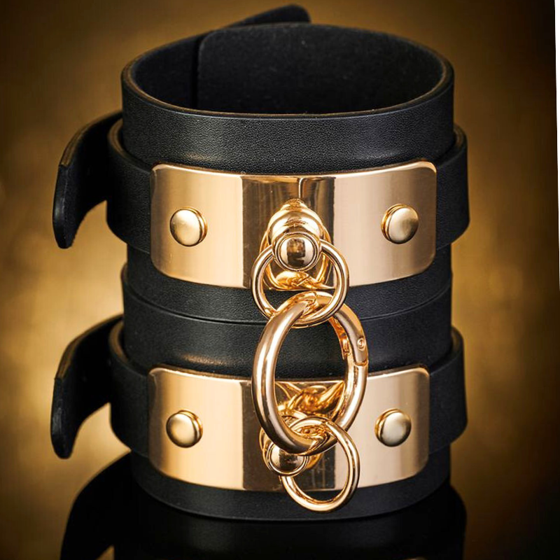 Élégant kit de menottes poignets et chevilles en vernis noire avec deux anneaux dorés et 4 mousquetons.