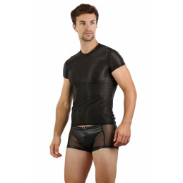T-Shirt Homme en micro résille noire avec un col V et manches courtes.Look moderne et sexy. ATTENTION: Toutes Les références de cette marque ont un délais complémentaire de livraison de 72 heures.