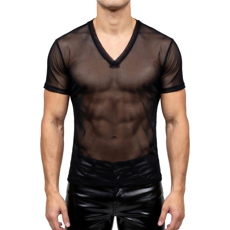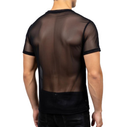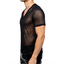 T-Shirt Homme en micro résille noire avec un col V et manches courtes.