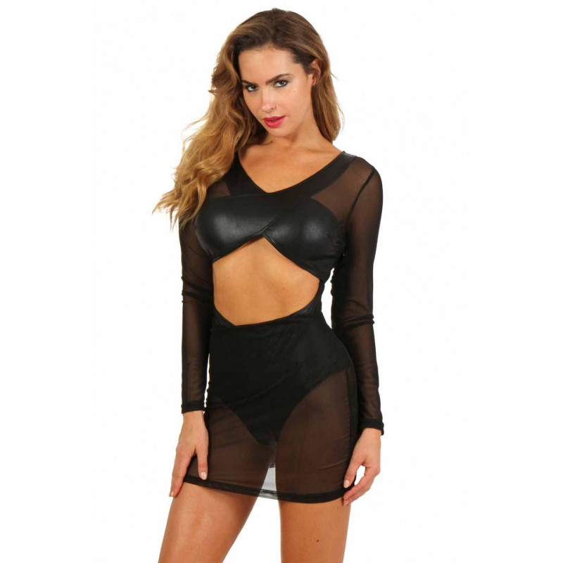 Robe noire en wetlook avec le haut et les fesses en micro résille floquée, col montant et sa bande en wetlook sur la poitrine.Zip invisible au dos. ATTENTION: Toutes Les références de cette marque ont un délais complémentaire de livraison de 72 heures.