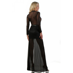 Très belle robe longue à manches longues en micro résille avec sa partie jupe courte en wetlook. Devant joli et profond décolleté bordé de wetlook. Manches longues. Robe longue fendu sur une jambe. En dessous une partie jupe courte en wetlook moulant. Matière élastique très confortable Composition : Polyester 90%, Elasthanne 10% ATTENTION: Toutes Les références de cette marque ont un délais complémentaire de livraison de 72 heures.