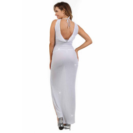 Robe longue transparente blanc pailleté avec son large décolleté tombant au dos.