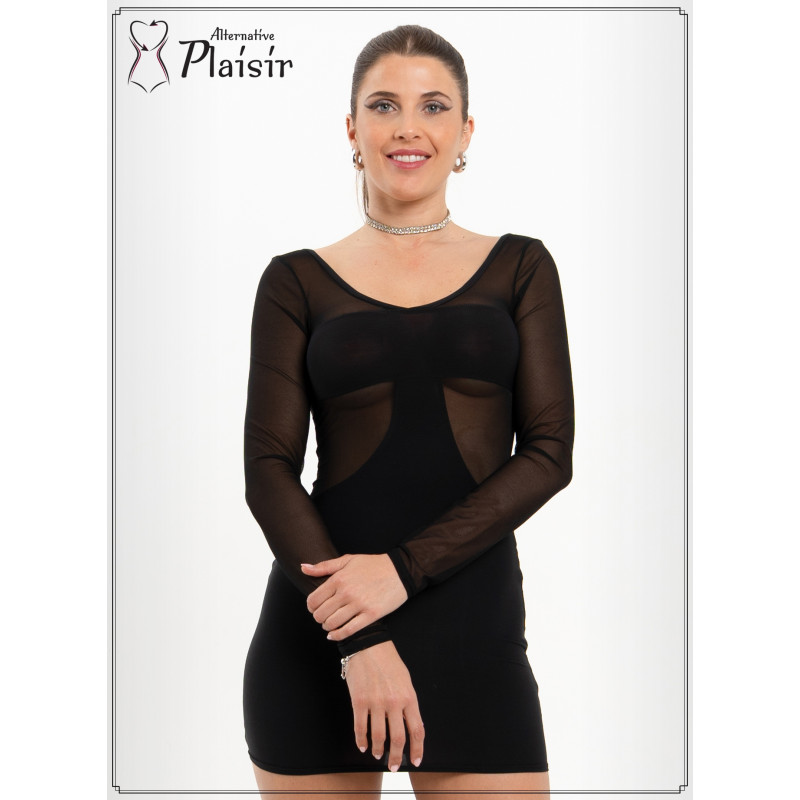 Robe opaque avec les cotés du buste en micro résille ainsi que les épaules et manches longues.