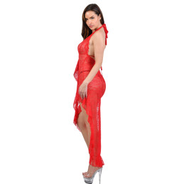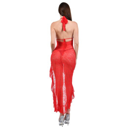 Sensuelle robe dentelle rouge au décolleté sexy avec sa fente bordée d'un volant d'un coté et un superbe dos nu.