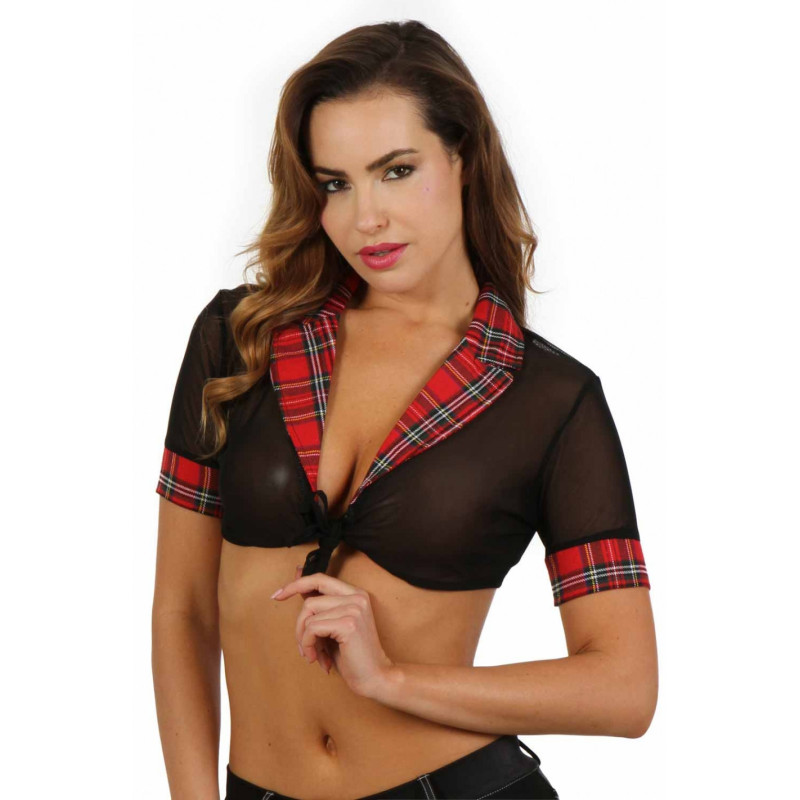 Un joli top manches courtes en micro résille avec son col et le bas des manches en tartan à carreaux rouges.