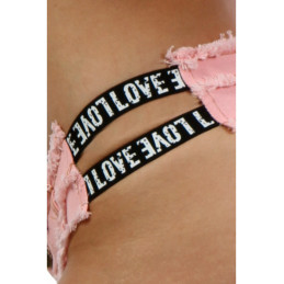 Sexy short échancré effet denim effiloché avec ses boutons devant et ses bandes noires élastiques imprimées "LOVE"